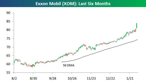 Hickey and Walters (Bespoke) submit: As the biggest stock in the world, Exxon Mobil (XOM) has a huge impact on the performance of widely followed cap-weighted stock market indices like the S&P 500. After Tuesday's $3.23 gain (its first gain of more than $3 since March 2009), XOM is up just under 50% since the S&P 500 made its 2010 correction low last July. As shown below, the stock has basically gone straight up in recent months.