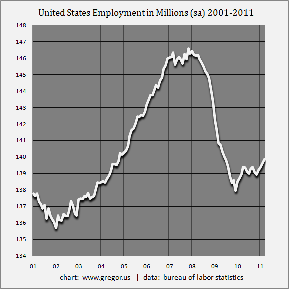 Total US employment has been oscillating around the 139 million level for the past year until recently, when some job growth started to appear in December and January. According to Friday?s report from BLS.gov, the first month of 2011 saw total employment rise to 139.864 million persons. A figure that regains levels last seen in late 2004. Of course, the structural problem of America?s labor market is unchanged, because of population growth during that same time period. At current rates of ?jobs growth? it would take until 2016 to regain the employment highs of 2006-2007. | see: United States Employment in Millions (seasonally adjusted) 2001-2011.